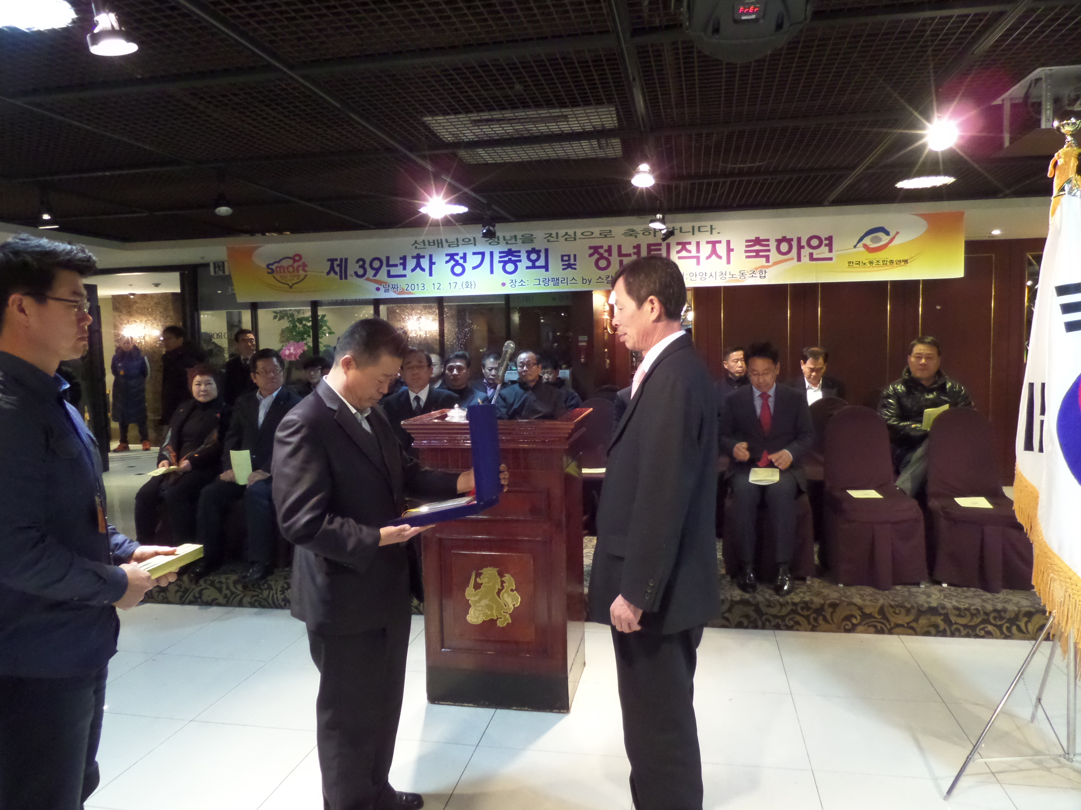 2013³â 12¿ù 17ÀÏÀÚ ¾È¾ç½Ãû³ëµ¿Á¶ÇÕ Á¦39³âÂ÷ Á¤±âÃÑȸ ¹× Á¤³âÅðÁ÷ÀÚ ÃàÇÏ¿¬ Çà»ç°¡ °³ÃֵǾú½À´Ï´Ù.